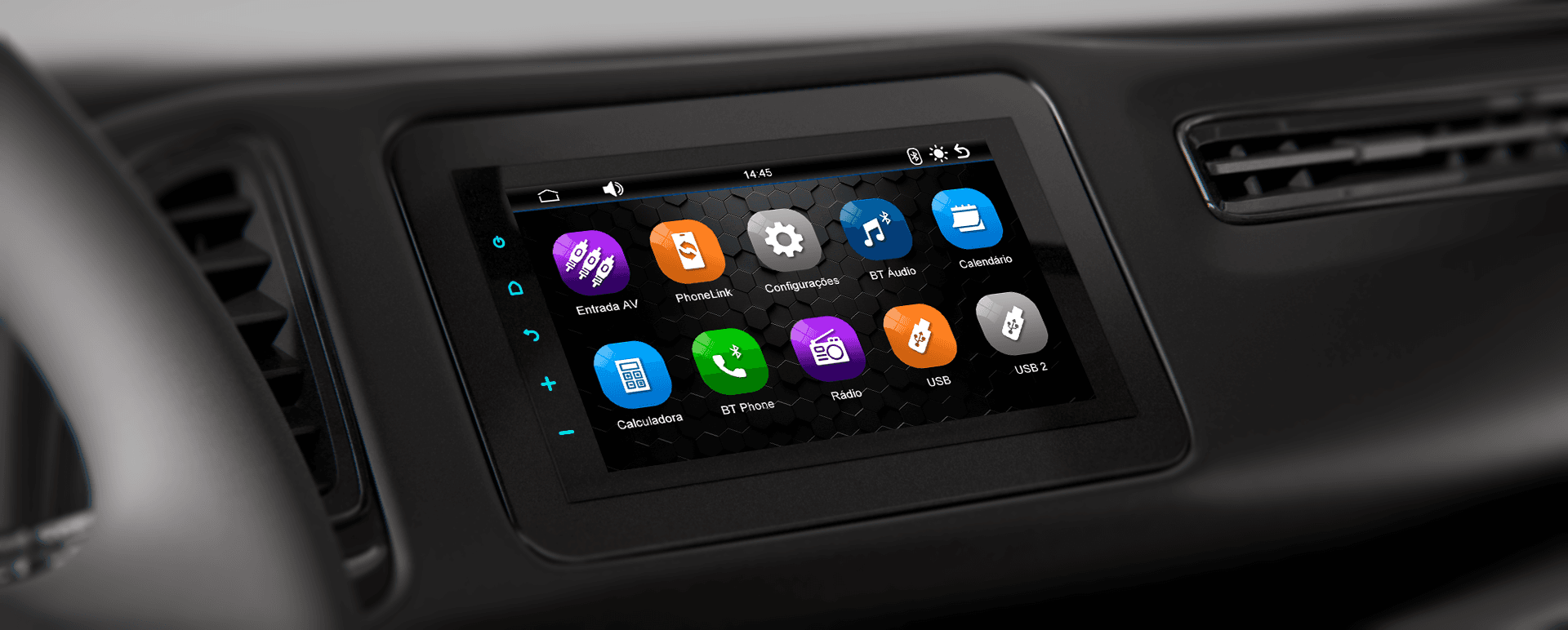 Tela LCD de 9 polegadas com vidro 2.5D, alta resolução e toque capacitivo. Interface moderna com ótima visibilidade e resposta imediata.