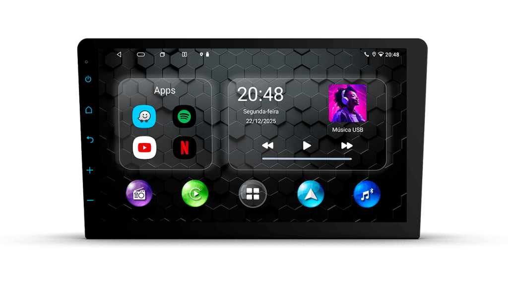 Além de CarPlay e Android Auto sem fio, espelhamento de tela, Bluetooth, Wi-Fi e entradas para câmera traseira e frontal, entrega mais conforto e segurança em cada trajeto.