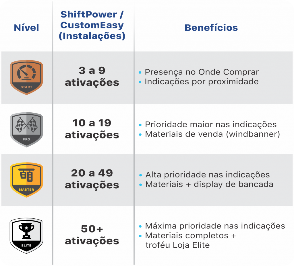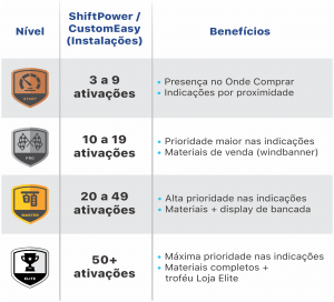 A avaliação considera o desempenho dos últimos 90 dias. E tem mais: lojas que vendem ShiftPower e também realizam ativações com o CustomEasy podem participar dos dois sistemas de ranqueamento.